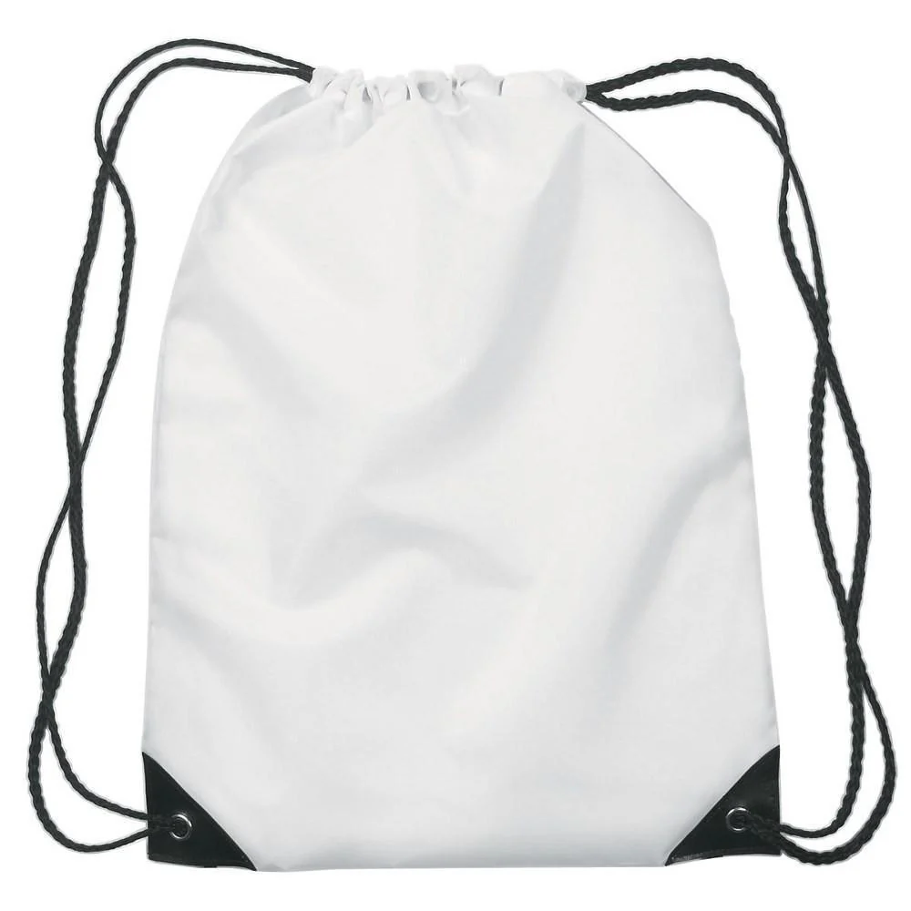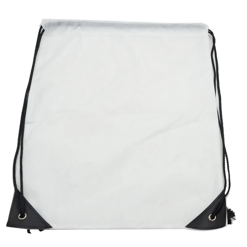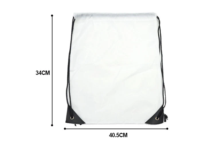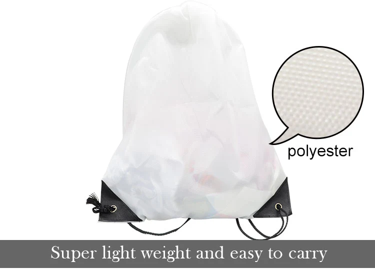 Our sublimation blank Super light weight drawstring bag is made of bright white 100% polyester and has a drawstring with pull cords and reinforcements Black PU corners & Black strings.